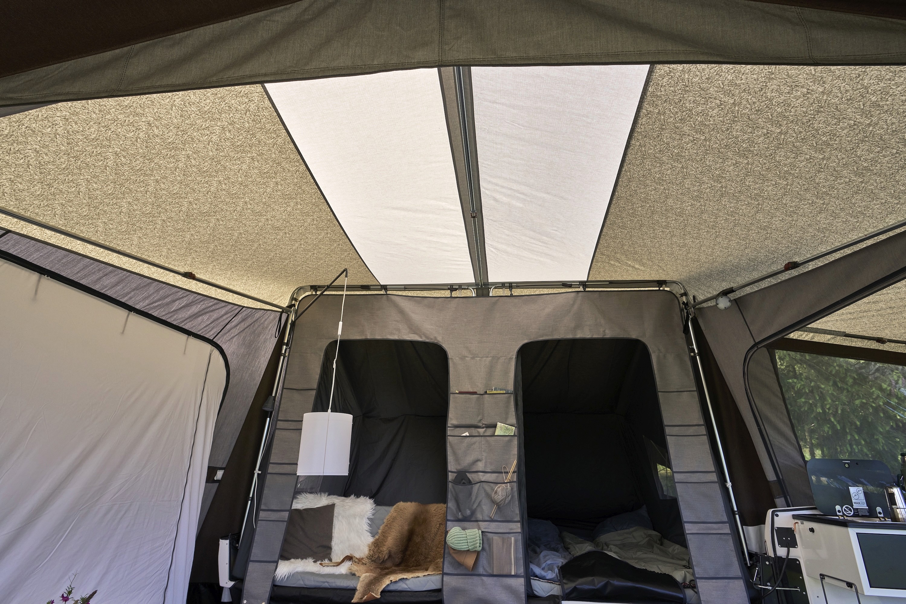 Two sleeping cabins, each housing two people on cold foam mattresses elevated on the trailer bed. The sleeping cabins are constructed in dark fabric to block morning light. Each cabin has ventilation openings with integrated mosquito nets and external flaps that can remain open in rain. A storage pelmet with pockets sits in front of the sleeping cabins. Under the sleeping cabins, a dry storage liner is installed after setting up Camp-let. Serving as both additional storage and barrier to close off the bottom of the Camp-let to your living area.