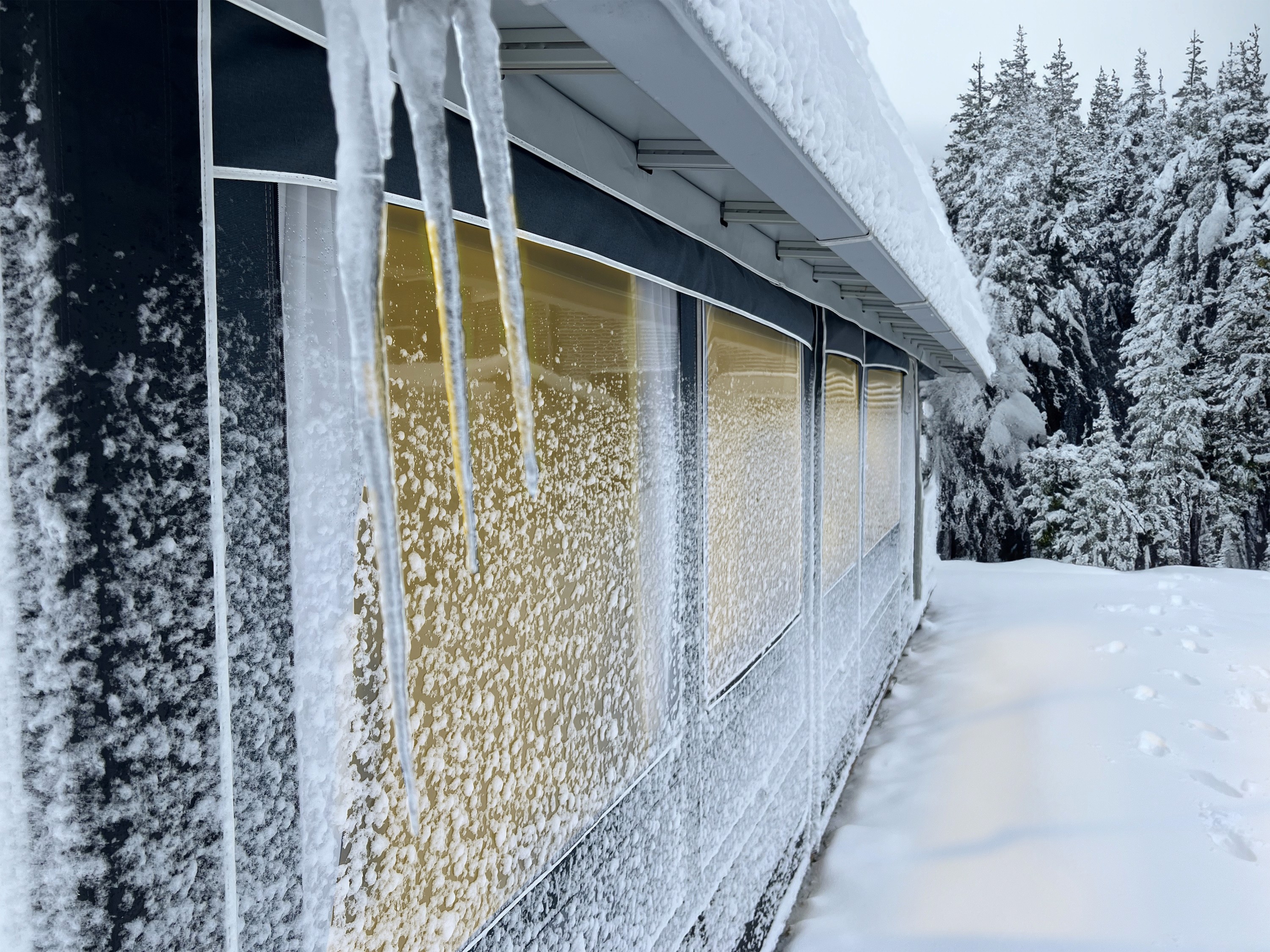 Snow accumulation: The Buddy's roof pitch is shallow. Snow does not shed the way it does on a steeply pitched structure. In snowfall, check the roof regularly and clear it with a soft brush before load builds. A light, dry snow presents little risk. Wet, heavy snow is the concern.