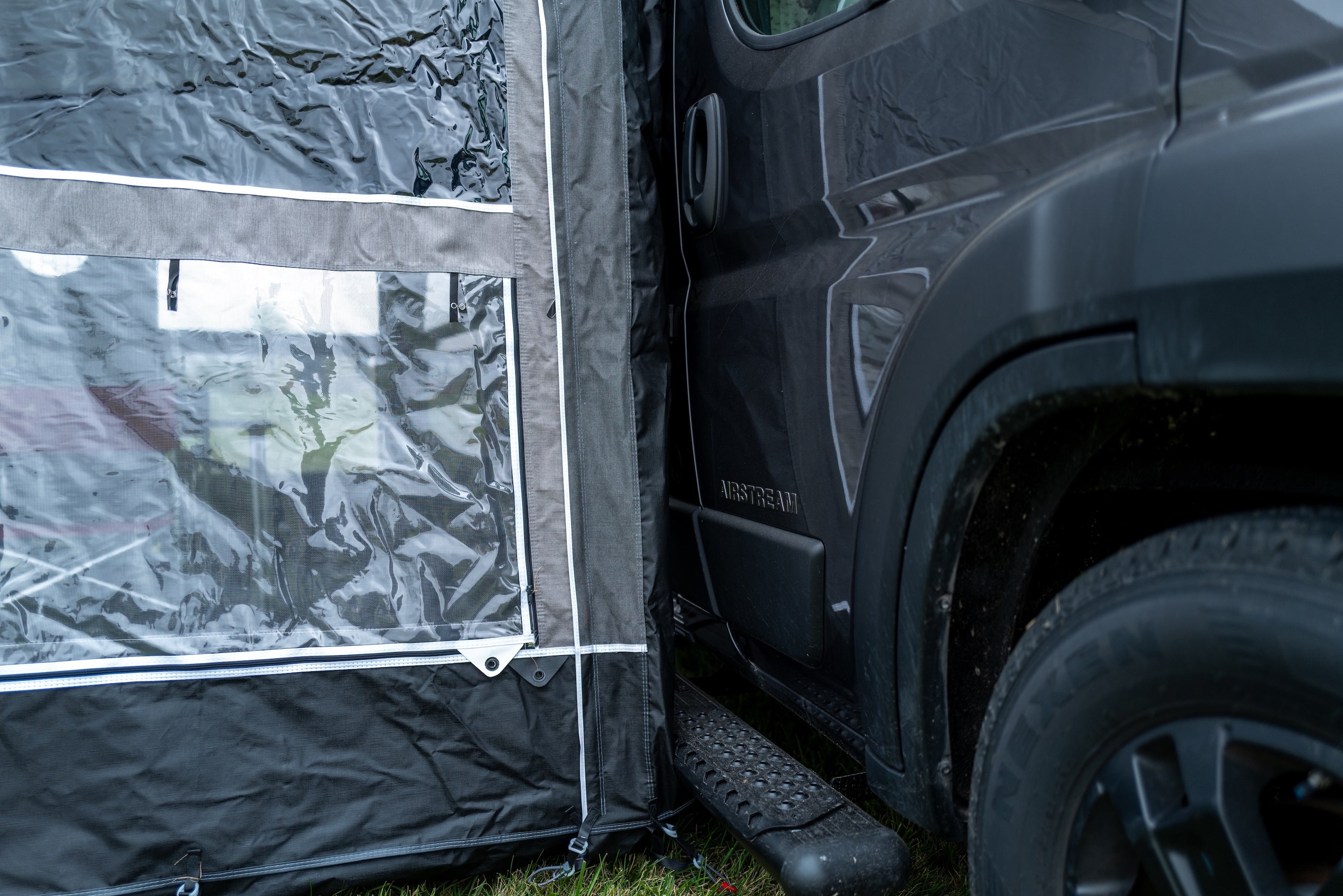 Buddy panels connect to the awning's roof with magnetic clips and durable suction cups to the side of your van. The seal is tight enough to hold against wind-driven rain. The panels release cleanly when you want to open up.