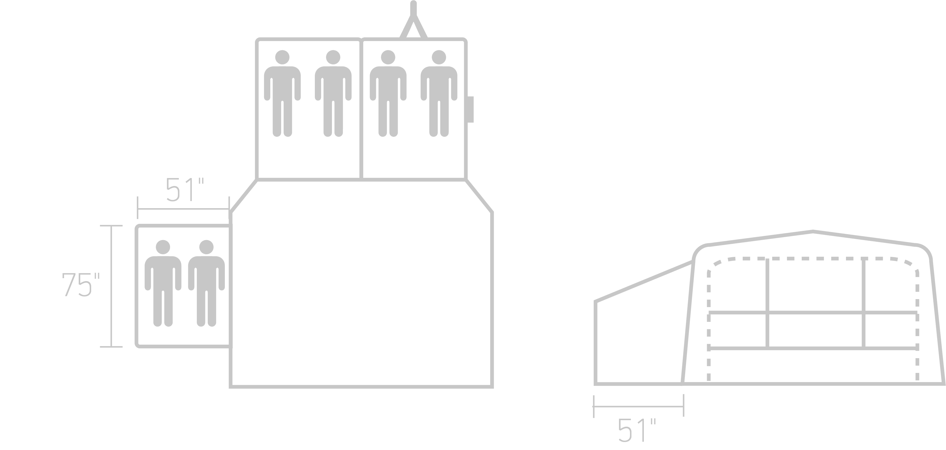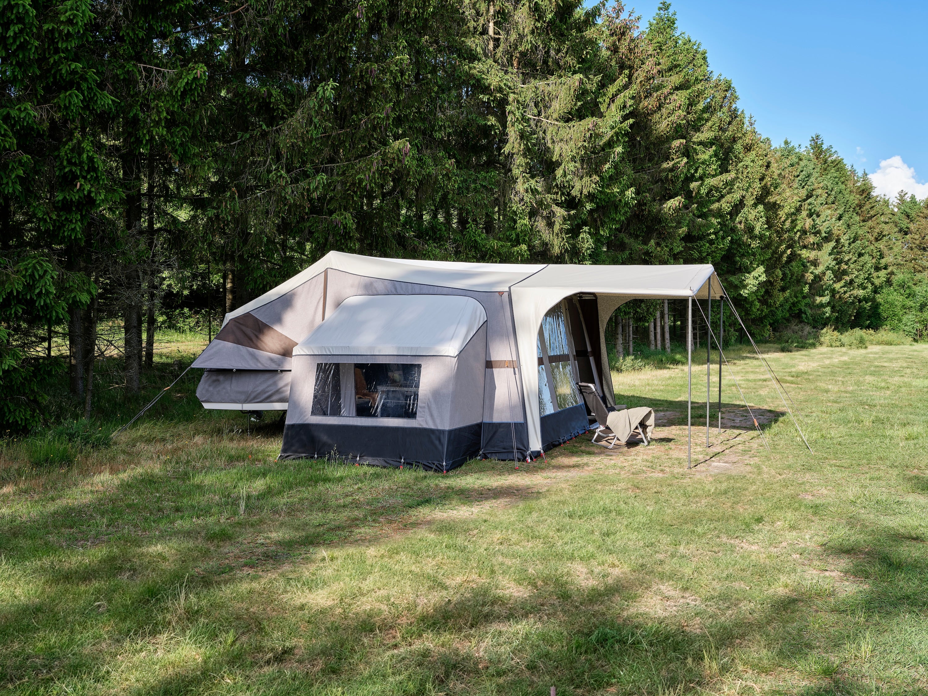 The Annex attaches by replacing one side panel of the Earth awning with a zip-in room. Poles give it shape and stability. Once set up, it reads as part of the original structure.