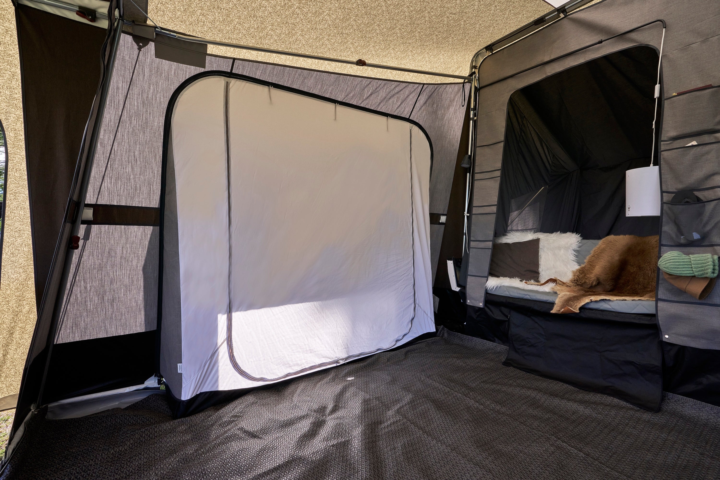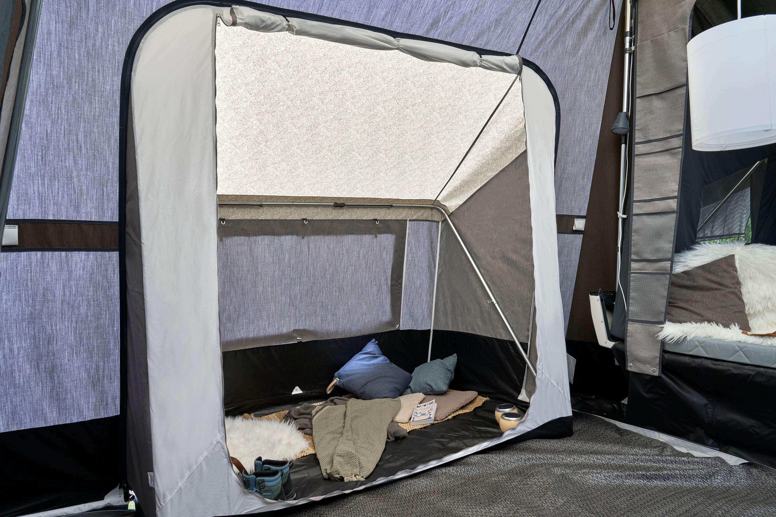 A zip-open window brings in light and airflow. An integrated privacy screen lets you close it off when you need to. Inside, a divider allows separation from the main living area.