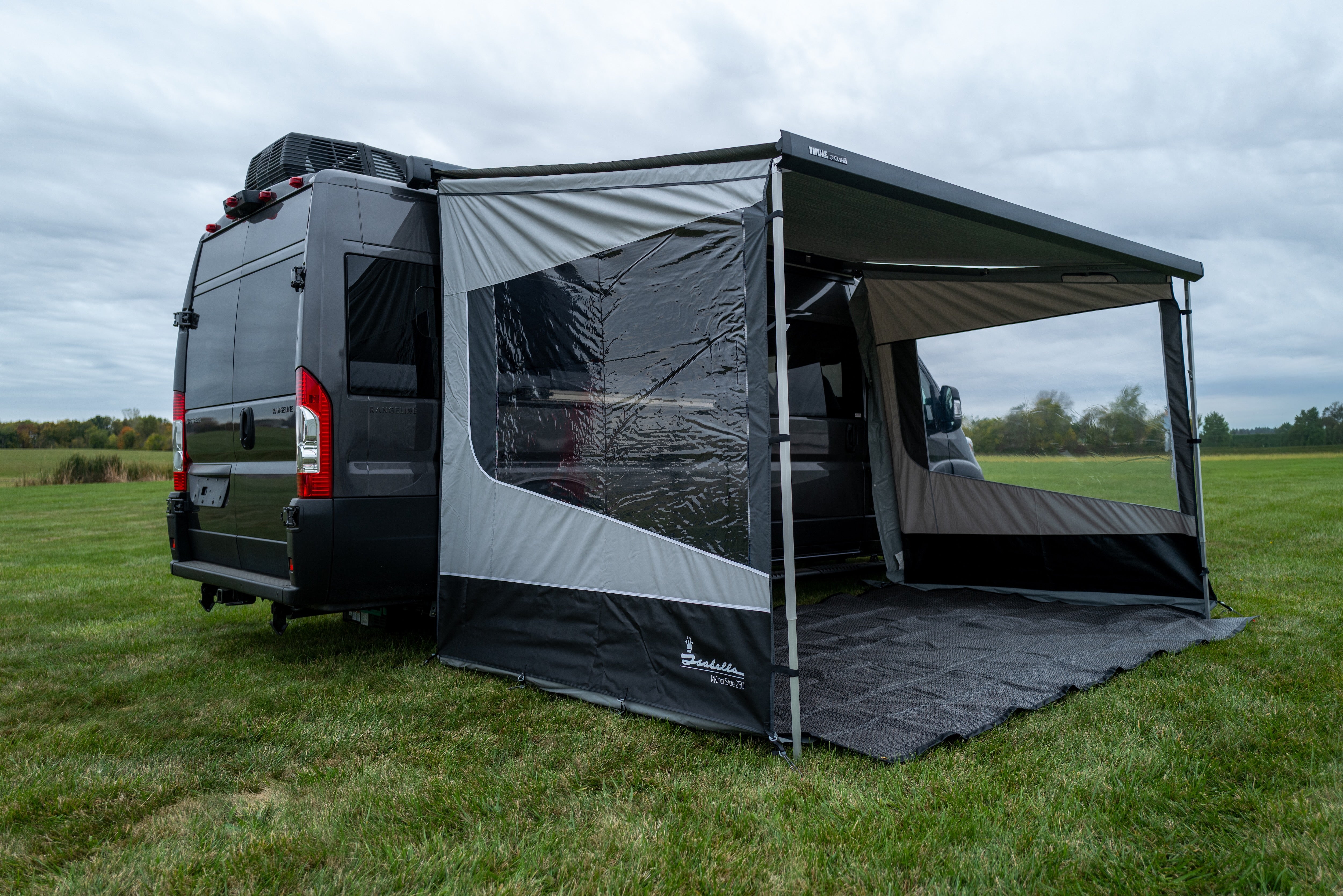 The oversized clear window brings in sunlight and keeps the space feeling open while still providing weather protection. The angled design gives the Wind Side a modern, Scandinavian look that complements both vans and larger RVs.