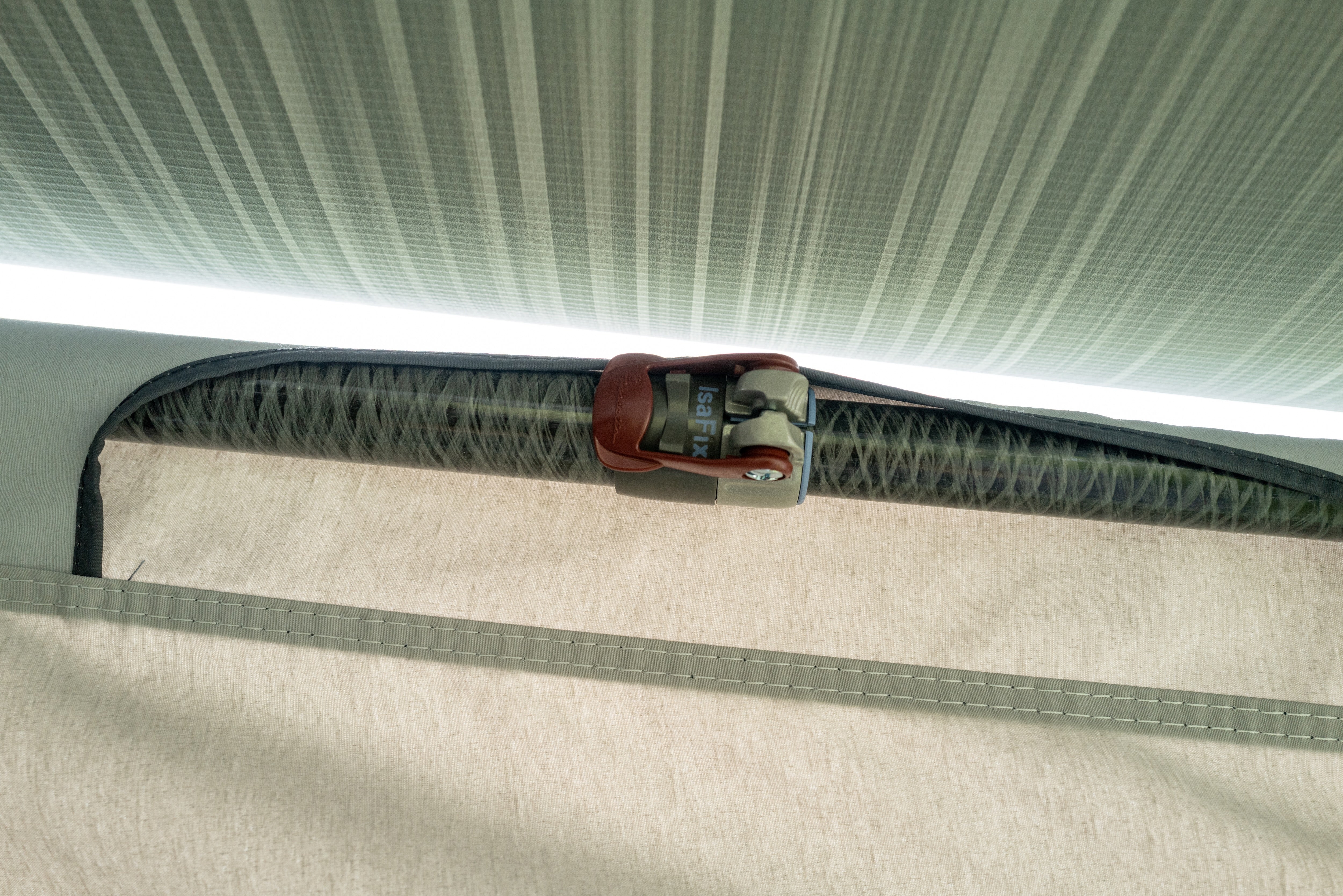The roof pole is crafted from CarbonX. A rigid, lightweight carbon-fiber composite known for its stability in changing weather. It includes a telescopic adjustment and an IsaFix locking bracket for simple tensioning.